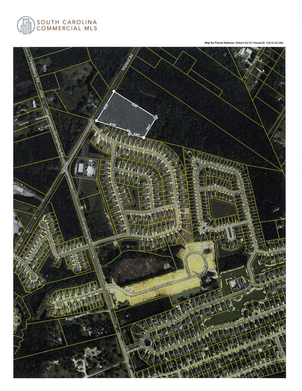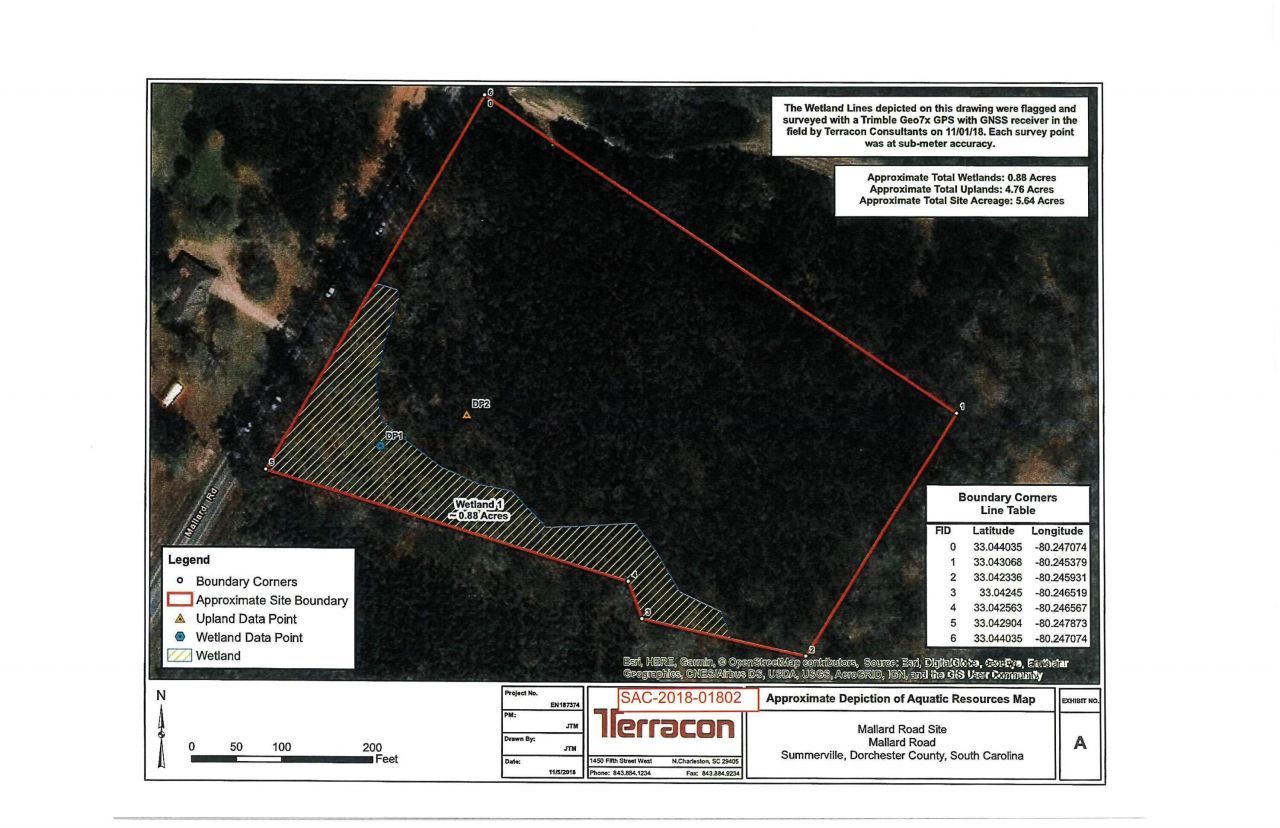 Adjacent to the new ''Mallard Crossing'' neighborhood developed by DR Horton, this 5.07 acre land parcel is prime for development. There are 4.76 acres of highground as determined by the attached Preliminary Jurisdictional Determination letter from The Arny Corps of Engineers. Property is zoned general commercial in Dorchester County which allows for many uses. Both water and sewer utility lines are near by (see attached zoning and utility maps). This parcel is in direct route back to Jedburg Road, interchange on I-26 (exit 194), and is just east of the new Spinx gas station at the corner of Mallard Road and Orangeburg Road. The approximate 3.74 acre parcel across the street at the intersection sold for $240k per acre last year. This is well located and surrounded by significant new rooftops and in the path of growth and progress. See attached maps, aerials, boundary/tree survey, and wetland map.