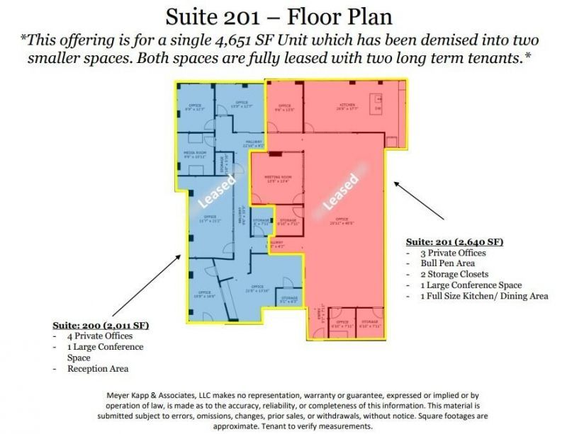 This offering is for two Fully Leased Class A Commercial Office Spaces totaling 4,651 SF. Suite 200 is +/- 2,011 SF and is Leased to a local Law Firm. Suite 201 is +/- 2,640 SF and is Leased to a Professional Financial Services provider. Both Leases are at above market rates with annual increases. Each Lease has approximately 7+ years of term.Location DescriptionThe Subject Property is located on Seven Farms Drive in the center of Daniel Islands' Commercial District. The building is within walking distance to the Daniel Islands many shops and restaurants.Subject Suites Description- Suite: 200 (2,011 SF) has 3 Private Offices, a kitchenette, 1 Large Conference Room, and Reception Area- Suite: 201 (2,640 SF) has 3 Private Offices, Bull Pen Area, 2 Storage Closets, 1 Large Conference Room, and Full-Size Kitchen & Dining Area. Access and AmenitiesThe building has frontage on Seven Farms Drive with parking and service in the rear. The suite features high-end finishes, common area bathrooms and elevator service.