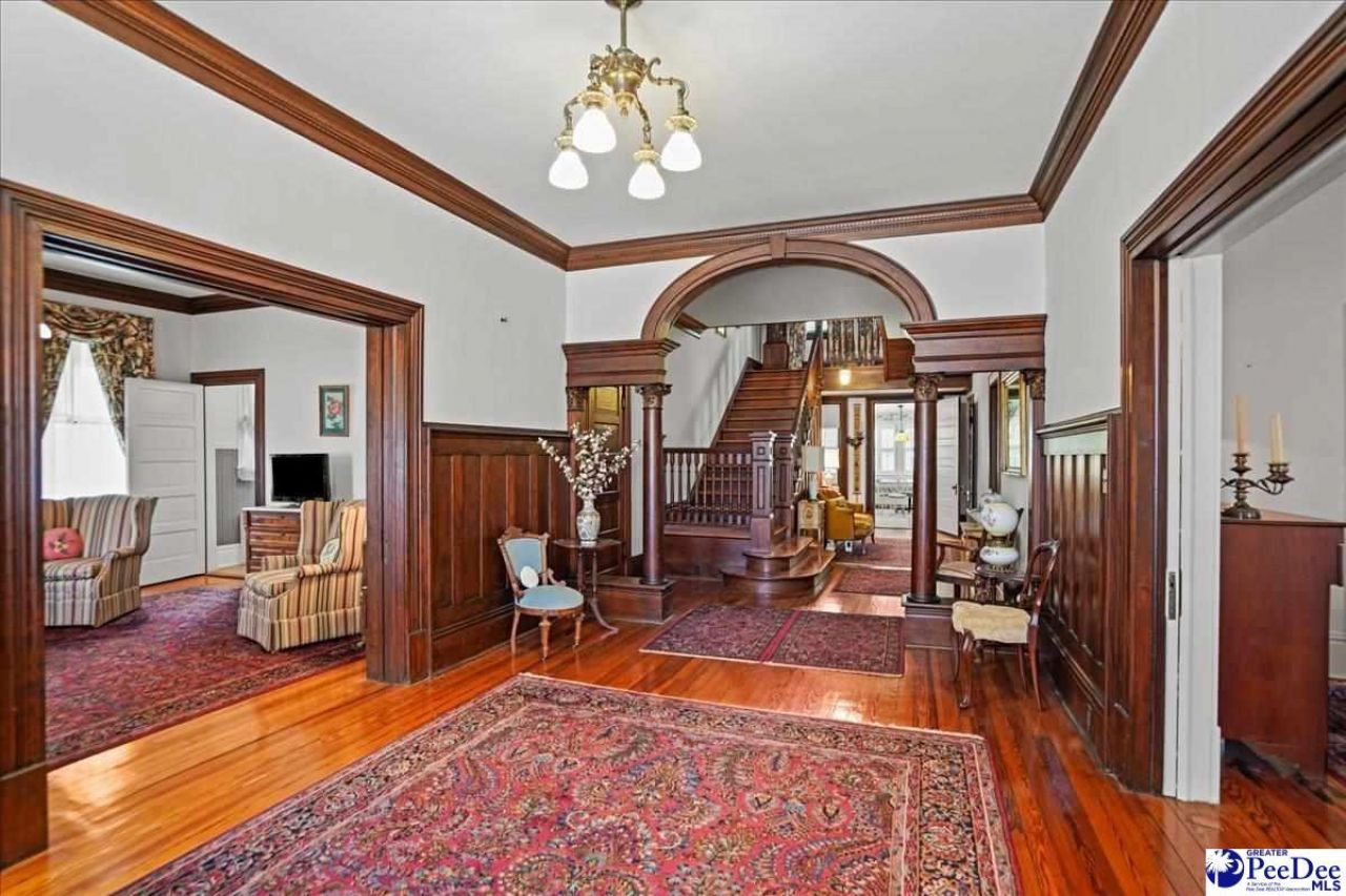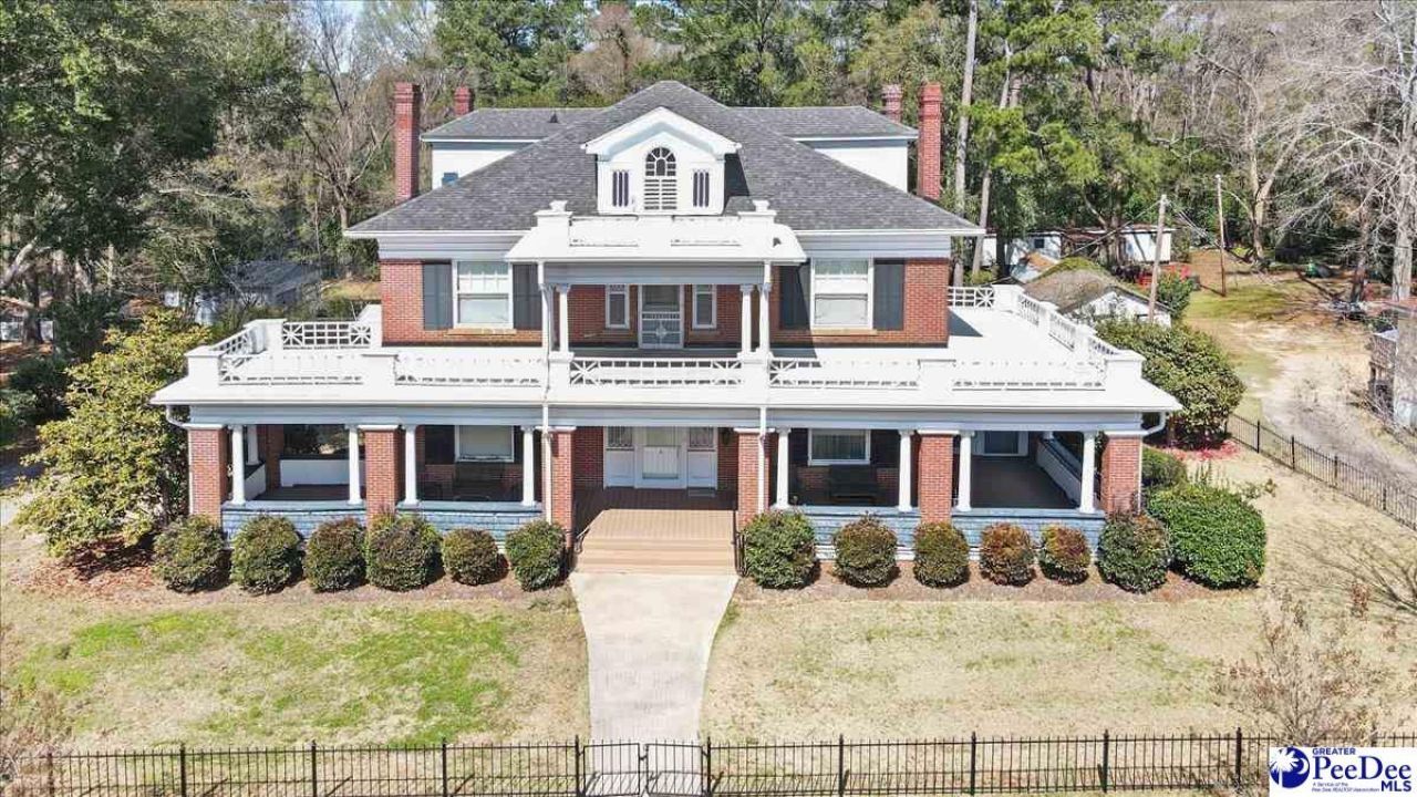Welcome to this beautiful and historic Colonial Revival home located in the charming town of Chesterfield, SC. Built in 1904 with handmade Pennsylvania brick and believed to be designed by noted architect Ernest Vincent Richards, this remarkable residence blends timeless character with expansive living space. Offering approximately 5,000+/-square feet, the home features 5 bedrooms and 3.5 bathrooms, all situated on nearly 2.45 +/-acres of picturesque grounds. The exterior showcases classic architectural elements including a hip roof, prominent chimneys, a dormer with a stunning Palladian window, and elegant Ionic columns resting above brick columns on the main level. A grand wraparound porch spans the front and sides of the home, while the second-floor porch with striking triple column groupings adds both charm and functionality. Inside, you'll find rich hardwood flooring, intricate woodwork, paneled wainscoting, and a graceful elliptical stair arch that highlights the home's historic craftsmanship. Multiple beautiful fireplaces serve as stunning focal points throughout the home, adding warmth and character to several living spaces. The spacious floor plan offers generously sized rooms throughout, complemented by a bright and inviting sunporch perfect for relaxing or entertaining. Significant updates have been completed in recent years, including a new roof and gutters installed in 2022, along with replacement of all wood balconies featuring new flooring and a durable rubber coating. HVAC system has also been upgraded within the last three years, offering improved comfort and efficiency. This property has been well maintained, including exterior repainting in 2020 and the addition of a generator for added peace of mind. Outdoor amenities include a rear patio, covered parking, detached garage, workshop and a large yard ideal for enjoying outdoor living. Pre-approval is required prior to showings. Don't miss the opportunity to own this exceptional piece of Chesterfield history.