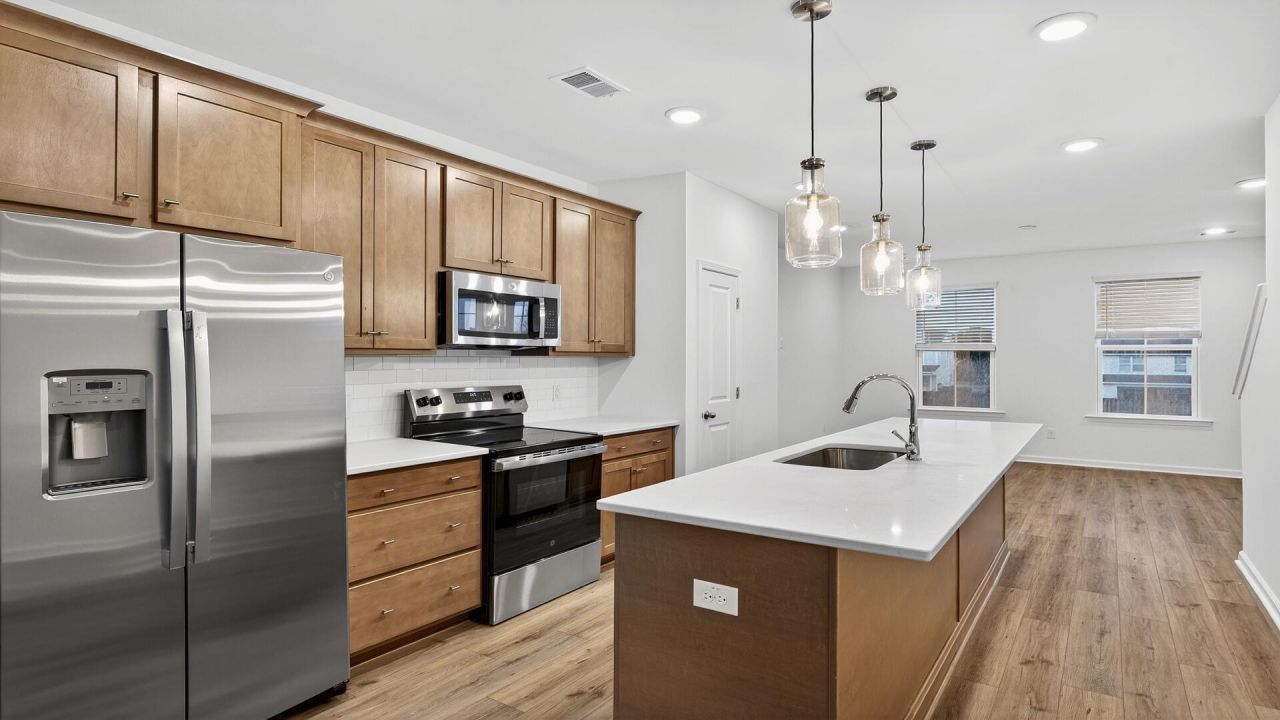 MOVE-IN READY NOW! END-UNIT! The Hayden is designed for flexibility, comfort, and everyday living. With three thoughtfully designed levels, this 3-bedroom, 3.5 bath home offers an open-concept layout that maximizes space and natural light. Whether you're working from home, entertaining, or simply relaxing, the Hayden adapts to your lifestyle. The first floor boasts a bedroom, full bath, flex room and an attached 1-car toy garage, ideal for additional storage. The open-concept second floor has a spacious family room, dining area, and kitchen with an oversized island, quartz countertops and a suite of stainless appliances. Whether you're a first-time buyer or looking for low-maintenance living, this Hayden offers both exceptional value and charm!