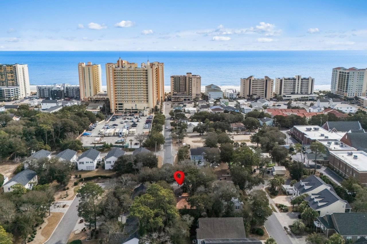 Coastal. Spacious. Well-maintained. 500 Roller Coaster Lane in the Ocean Drive section of North Myrtle Beach offers a 2400 heated sqft 4-bedroom, 3-bath home just a short walk or golf cart ride to the beach, with no HOA and no HOA fees. Sold furnished. This 2-story, 4-sided brick residence sits beneath mature oak trees and features a large paver driveway, carport, metal roof covered surf shack with electricity for golf cart, bikes and/or beach gear, and a house metal roof installed in 2018 with gutter guards installed in 2025. Major systems include two heat pumps with the upstairs unit replaced in 2022 and a water heater installed in 2023. Smooth ceilings run throughout, and a security system is in place. Property is not in a high-risk flood zone (Flood Zone X). The 1st level includes 2 bedrooms and 1 renovated bathroom. Wood-like tile flooring extends throughout, creating a durable and cohesive space ideal for beach living. The combined family room, dining area, and wet bar (includes sink and 2024 refrigerator) provide flexibility for everyday living or entertaining as the party spills out into the fully fenced backyard. This area could also be used as a Recreation Room. The updated bathroom has a 5 tiled shower with seat and glass doors, all new vanity, toilet, lighting, and plumbing fixtures. 2 bedrooms: the first is set up as a guest bedroom while the 2nd is currently used as a double office (easily used as a bedroom too). The laundry room includes a side-by-side washer and dryer (new in 2024) along with a convenient laundry chute from the upstairs hall bath. Upstairs you have another 2 bedrooms and 2 full baths both with stylish ceiling fans. The ¾ tongue-and-groove cherry wood floors add warmth and character. The kitchen, living room and dining area have an open concept with tons of natural sunlight. The kitchen is designed for both function and style with terrazzo countertops, a copper farmhouse sink and backsplash, stainless steel appliances including a French door refrigerator (2025) and Frigidaire dishwasher, and a center island with range and breakfast bar seating. The spacious 17x 11 living room has comfortable seating and a wall mounted TV. The adjacent dining area offers attractive outdoor views and direct access to a large 12x20 deck over the carport, ideal for grilling, entertaining, or enjoying both coastal days and evenings. The primary bedroom features a pocket door, ceiling fan and a renovated (2023) en-suite bath with barn door entry, tiled shower with sliding glass doors, new vanity, updated light & plumbing fixtures, and new tile flooring. The additional guest bedroom includes a ceiling fan and easy access to the hall bath with tile floors, updated toilet, and shower. The fully fenced backyard is designed for low maintenance, entertaining and privacy with a 6 privacy fence and two gates on either side of house (one double, one single). River rock landscaping, paver walkways and patio areas, and Astroturf-style