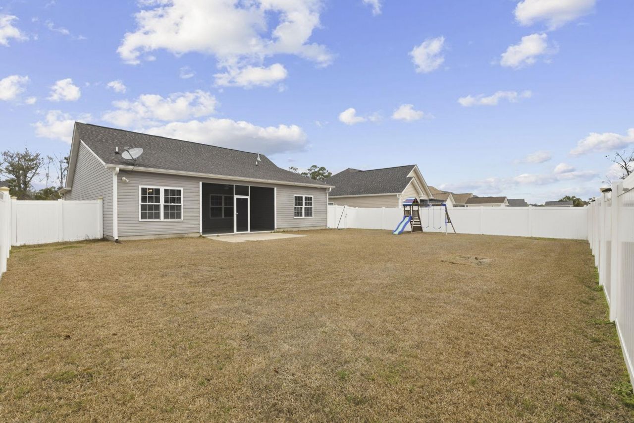 Welcome home to this 4 bedroom, 2 bath home in Barons Bluff North, offering a comfortable layout and space to grow. Step inside to a foyer that brings you to an open and airy living room with vaulted ceilings that create a bright, welcoming feel. The main living areas feature LVP flooring while the bedrooms offer cozy carpet. The kitchen flows easily from the living space and includes granite countertops, stainless steel appliances, a gas stove and oven, a pantry with shelving, and a dedicated dining area, making it easy to gather for weeknight dinners or casual get-togethers. Additional features include a tankless hot water heater and gas heat for added efficiency and comfort. The primary suite is conveniently located on the first floor and features tray ceilings, along with an ensuite bath complete with a walk-in shower. Two additional bedrooms on the main level share a full bath, offering practical space for family, guests, or a home office. Upstairs leads to the fourth bedroom that can flex to fit your needs- playroom, media room, hobby space, or quiet retreat. A separate laundry room with hookups adds convenience, and the attached two-car garage provides additional storage and functionality. Out back, enjoy a screened-in porch that opens to an extended patio and a fenced yard that includes swing set, perfect for pets, kids, or simply relaxing outdoors. Barons Bluff is a beautiful community featuring lakes, street lighting, sidewalks, a pool, and a cabana area while offering both charm and everyday convenience. Residents of Barons Bluff North enjoy convenient proximity to Highway 90 for an easy commute, and is just about 2025 minutes from the beautiful beaches of Myrtle Beach. This home offers space, character, and the opportunity to make it your own in a neighborhood many buyers love. If youre looking for a solid home with room to personalize and grow, this is the one! Photo (1) edited to remove car from driveway and photo (31) digitally staged to show new flooring that will be added soon.