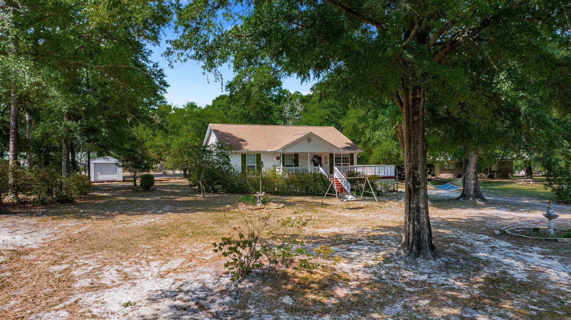 Adorable Lowcountry style home featuring charming white picket railings and a welcoming wraparound porch, all nestled on 3/4 of an acre. This beautifully maintained single level home offers comfort and relaxation located outskirts of town. Upon entering, youll immediately notice the stunning oak hardwood floors that flow seamlessly throughout, complemented by crown molding, base molding and chair rail accents that add timeless character. The kitchen is both functional and inviting, showcasing oak cabinetry, granite countertops, a double stainless-steel sink, and stylish pendant lighting. It is equipped with a smooth-top GE stove, GE Microwave, and a Samsung stainless steel refrigerator. The open-concept dining area connects effortlessly to both the kitchen and living room, creating the perfect space for gatherings and everyday living. The front living room is filled with natural light from double windows and includes a ceiling fan for added comfort. The primary bedroom offers a walk-in closet, ceiling fan and a private full bath with a tub/shower combination. Two additional guest bedrooms also feature ceiling fans and share a full bath with a tub/shower combo. Additional highlights include storm glass doors at both the front and side entrances, a gutter system and an attached side storage room with built-in shelving. The roof is approximately 2/3 years old and the HVAC system is a 2.5 ton and new in 2021. Outside, youll find a detached 12 x 24 metal shed complete with electricity, double ceiling fans, built-in shelving and a roll-up garage door-perfect for storing lawn equipment or creating a workshop space. Dont miss your opportunity to enjoy peaceful country style living with modern conveniences in this charming Lowcountry home and a short distance away from a public boat landing on the Black River, fishing lovers paradise.