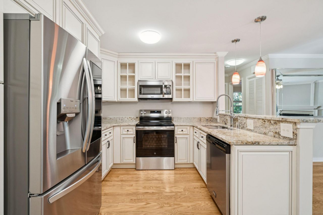 Filled with natural light, this first-floor condo has been updated with a keen eye for finishes. The open living area leads to a private patio overlooking a peaceful pond and fountain. The stunning kitchen features high-end appliances, gorgeous cabinetry, sleek countertops, a wet bar, and custom wine storage. Two bright bedrooms and a refreshed bathroom complete the interior. Select furnishings may convey with an acceptable offer, including nearly new bedroom furniture. Located in a gated community with a pool and walking trails, this home offers exceptional convenience close to shopping, the airport, the joint base, and more.