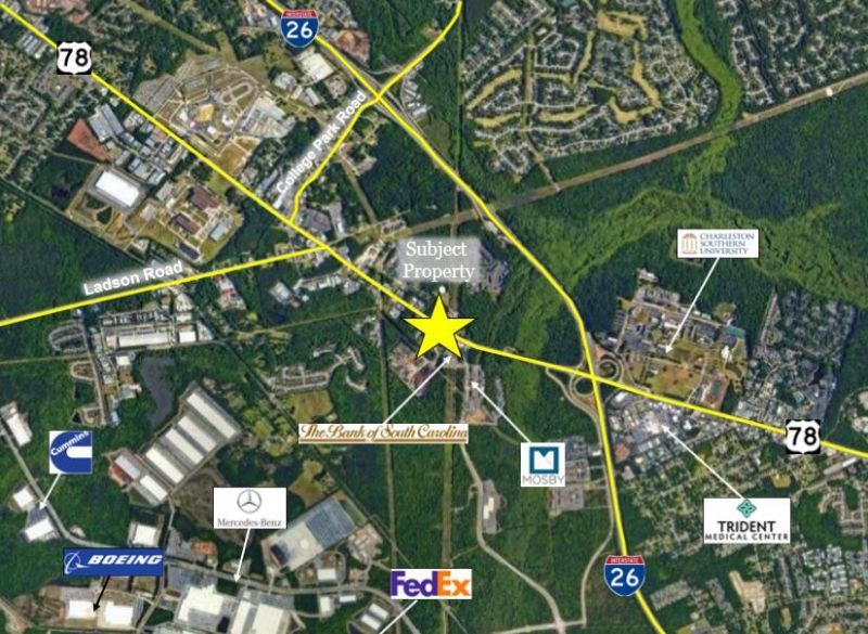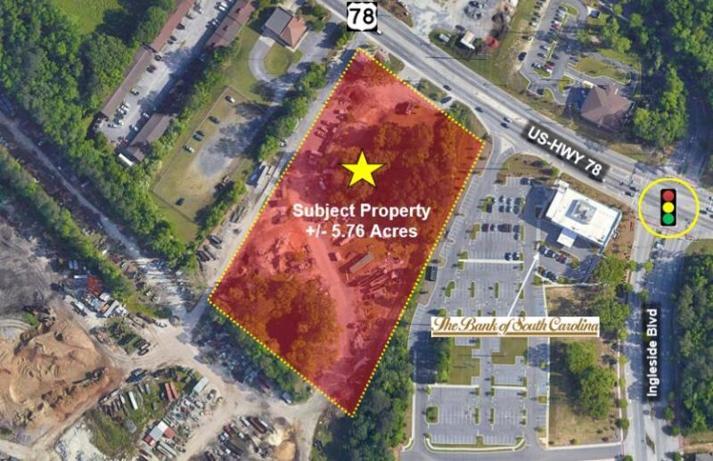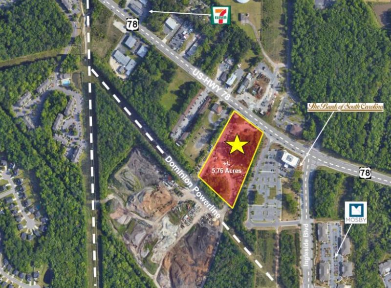 The Subject Property is located at 9409 US-HWY 78, adjacent to The Bank of South Carolina Building. +/- 5.76 Acre Lot with 277.2 feet of frontage along US-HWY 78, currently seeing 46,110 vehicles per dayThe parcel would be an ideal site for retail, c-store, or carwash usersSubject property is currently zoned as General Commercial in Charleston County. The Land is identified as Charleston County : TMS #: 390-00-00-111Parcel is in close proximity to a lighted intersection between US-HWY 78 and Ingleside Boulevard.